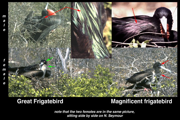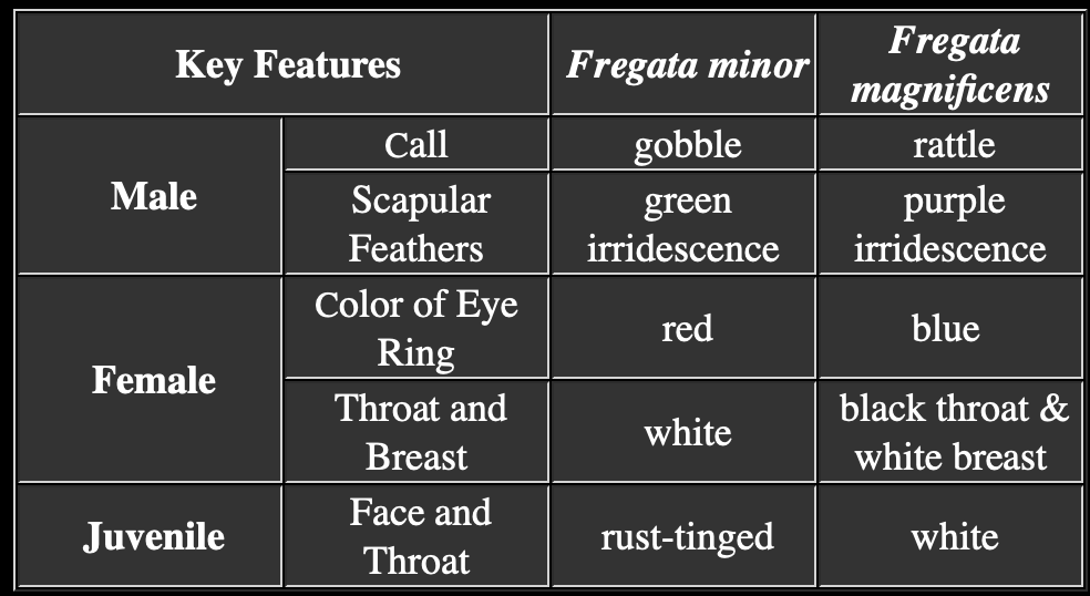 The two species of frigatebird are very similar to one another, the males being the most difficult to distinguish. The call is one of two ways to distinguish the males of the two species from each other. Great frigatebirds make a “gobbling” sound, not unlike a turkey, while magnificent frigatebirds make a rattling or drumming sound. A second, more subtle way to distinguish the nearly identical males is to look at the scapular feathers, long feathers that cover their shoulders. Although the feathers are black, they are irridescent and produce different colors when they refract sunlight. In magnificent frigatebirds the irridescence is purple while in great frigatebirds it is green. It is easier to distinguish the females and juveniles. A summary of differences are: