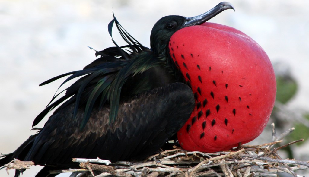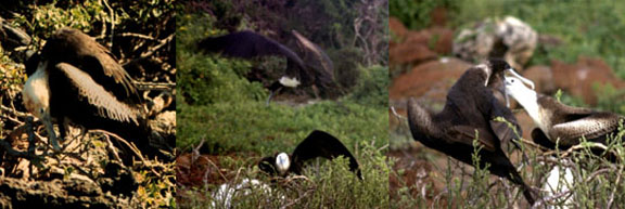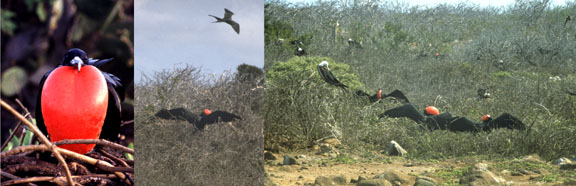 Male frigatebirds are black with a patch of red skin at the throat that is the gular sac. During courtship display, the male forces air into the sac, causing it to inflate over a period of 20 minutes into a startling red balloon. As males tend to display in groups, the effect is magnified. Then the males sit quietly in the low shrubs watching for a female to fly overhead. At this, the males waggle their heads from side to side, shake their wings and call. If the display is attractive enough, then the female will land and sit beside her amour.