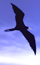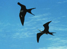 The name “frigatebird” calls to mind the sails of ships and, indeed, frigatebirds sail gracefully in the air currents overhead. Their wingspan is some 7.5 feet and their deeply forked scissor-like tails afford them ultimate maneuverability. Their other common name, however, the “man-o’-war” bird, reflects the way in which they use their consumate flying and maneuvering skill. Frigatebirds are pirates who harass incoming birds, especially boobies until the victim is so upset that it disgorges its catch. The frigatebird then drops with amazing speed and plucks the bolus out of the water, or even catches it before it hits! Not only do frigatebirds harass other species, but other frigatebirds as well. The disgorged bolus may pass through several beaks before it is finally swallowed. In addition to stealing food from boobies and from one another, they steal nesting materials as well. It was this kind of piratical maneuvering that caused the two juveniles to crash into each other and fall into the sea.