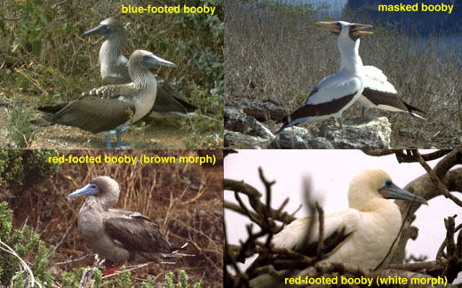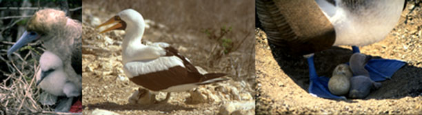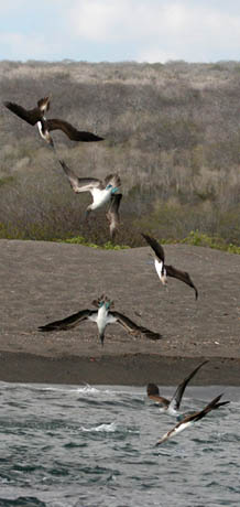 All three birds have similar body shapes, and they lead similar lifestyles, but refrain from competing with one another because they fish in different areas. Blue-footed boobies tend to fish very close in to shore, masked boobies a bit farther out, and red-footed boobies fish well out at sea. The distributions of their fishing grounds influences the distribution of their nesting sites. Blue-footed boobies nest in the center and edges of the archipelago (Espanola, Daphne, and N. Seymour). Similarly, masked boobies tend to nest at the edges of the archipelago (Daphne, Espanola, Genovesa), while red-footed boobies tend to be found only at the fringes of the archipelago (Genovesa and Punta Pitt on the northeaster tip of San Cristobal). Because of their distribution, it is typically the blue-footed booby that visitors tend to see fishing.