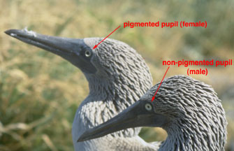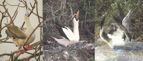 It is fairly easy to distinguish males from females by voice – males make an asthmatic whistling sound while females croak. Blue-footed boobies can also be distinguished because the females have a ring of dark pigment around their pupils, making them look bigger than those of the males. Red-footed boobies are dimorphic for plumage. About 95% of the birds have brown plumage while 5% have a white plumage very similar to that of the masked booby. It is curious that in red-footed booby populations in other parts of the world, the percentages are reversed, with the white morph being the more abundant They are, nevertheless, the same species and, if you are lucky, you can see a brown/white pair.