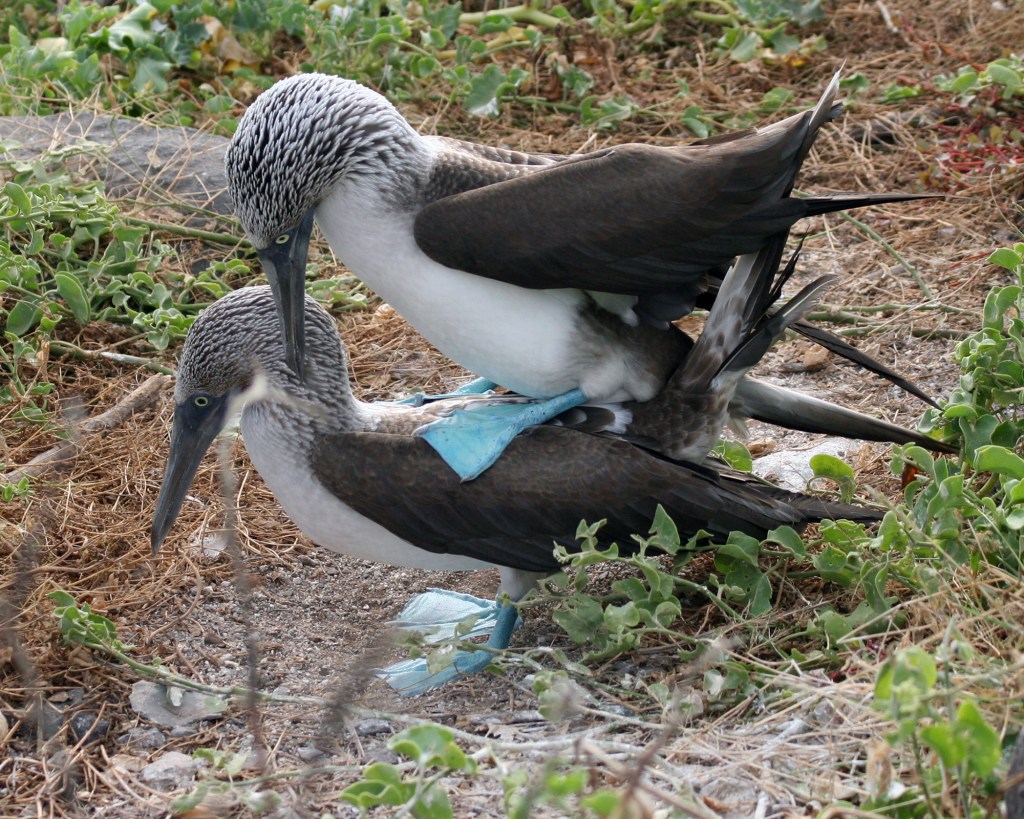 Boobies belong to the family Sulidae, which also includes gannets. In the Galapagos, there are three boobies: the masked booby (Sula dactylatra), the red-footed booby (Sula sula) and the blue-footed booby (Sula nebouxii). Despite the obvious color differences, the three boobies are very similar in body shape, with the masked being the largest and the blue-footed the smallest. Though small by comparison, the blue-footed booby has, proportionately, the largest tail of the three. All three have torpedo-like bodies with sharply pointed beaks. Indeed, the local Spanish name, “piquero” is derived from the beak shape: “piquero enmascarado” (masked booby), “piquero patas rojo” (red-footed booby), and “piquero patas azul” (blue-footed booby).The origin of the name booby is less clear, probably derived from Spanish “bobo”, or clown, in reference to their habit of landing on ships at sea and being easily approached – and killed – by sailors.