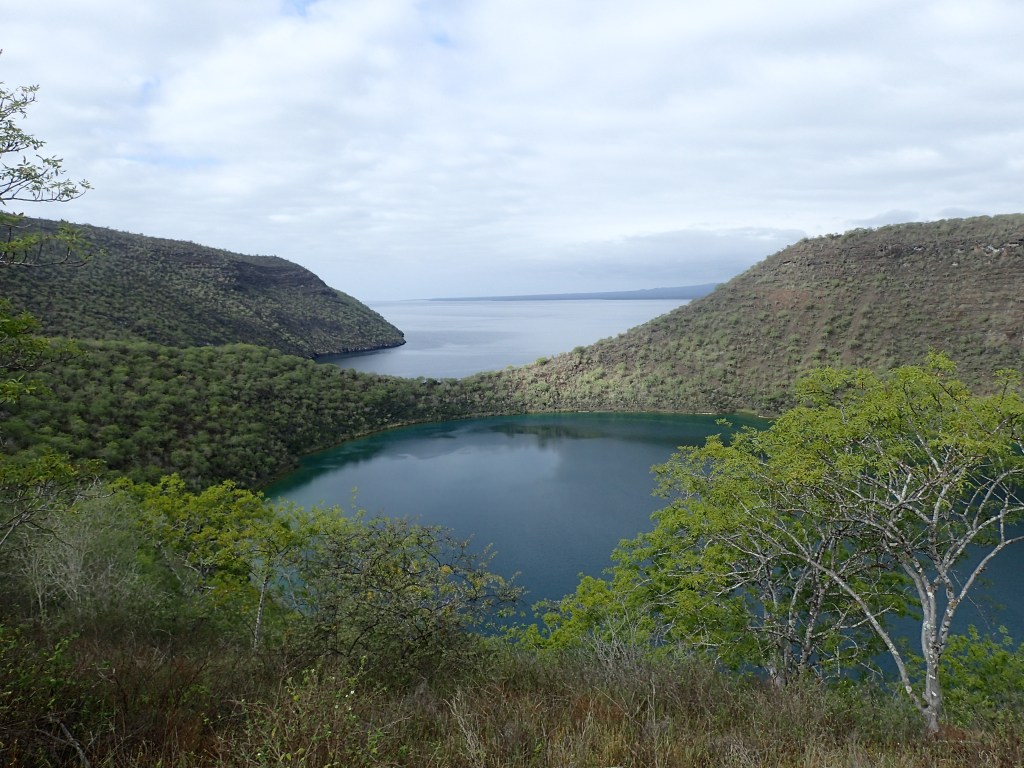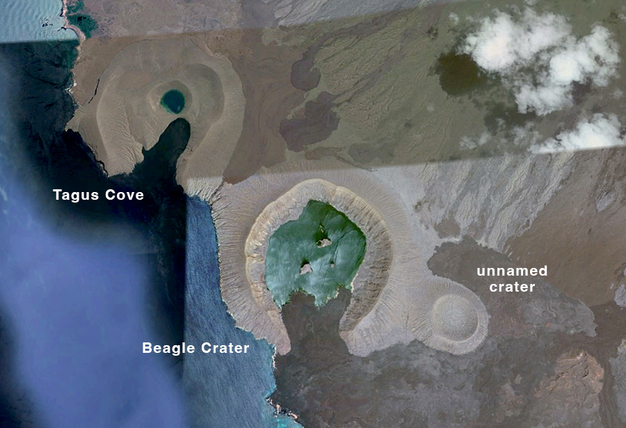 Tagus Cove is geologically interesting. It is a tuff cone within a tuff cone. Tuff cones are caused by phreatomagmatic reactions, where water comes in contact with erupting lava. At Tagus Cove, the outer cone formed first, followed by the inner cone, which erupted through a lake at the bottom of the older crater. The inner crater also has a lake, Lake Darwin, filled with very salty water. At a later date fissures on the rim of the outer cone produced a series of small half cones (because of prevailing winds at the time) that formed as spatter cones because they were protected from contact with water.
