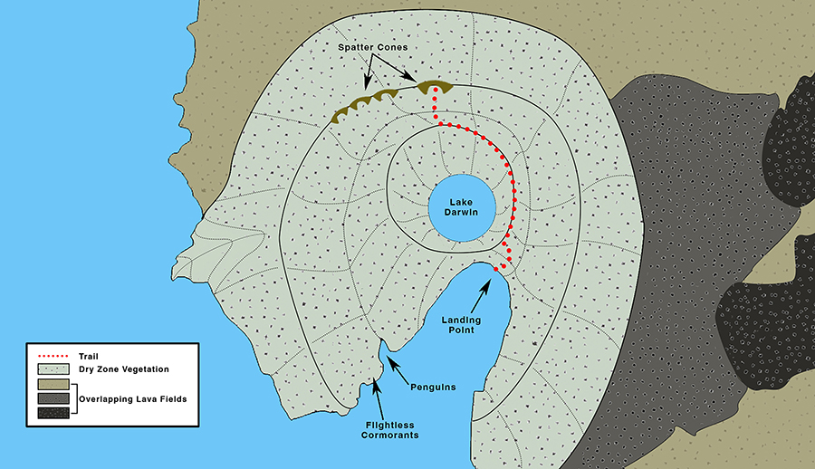 The trail begins as a series of steps climbing to the rim of the inner cone. Half way around the cone, the trail crosses over to the highest point on the rim of the outer cone, where one obtains a spectacular overlook of Volcán Darwin, Fernandina, Volcán Wolf, and Volcán Ecuador.
