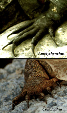 Marine iguanas possess a variety of physical and physiological characteristics that permit their unusual feeding habits. Iguanas in general have considerable swimming abilities, which are improved upon in the marine iguana. Their tails are flattened and they swim by lateral undulation of their bodies, with their limbs held to the side (check out the underwater scene in “Godzilla”!). Their claws are long and sharp by comparison to the land iguana, to enable them to cling to rocks along the shore, and resist being pulled away by heavy waves. Presumably these same claws enable them to cling to their underwater feeding sites.