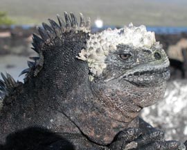 During the course of their feeding, marine iguanas ingest large amounts of salt water. They, like other iguanas, possess salt glands, located between their eyes and nostrils, which concentrate and remove salt. The salt is deposited in the nostril where it is subsequently ejected by a “sneezing” action. This ejection occurs periodically, and is also used to warn of intruders, especially over-inquisitive tourists. The spray often shoots up into the air and then falls back on the head, where it forms the white “wig” often seen on marine iguanas.