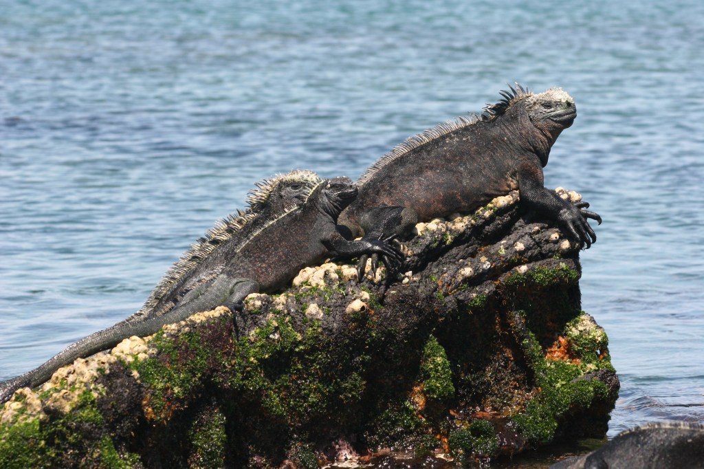 Marine iguanas are vegetarians, feeding primarily on sea weed in the intertidal zone. The biggest individuals, typically males, however, will swim out past the breakers and feed underwater. Their dives are typically shallow, 1.5 – 5 m, but large adults dive to depths of 15 m or more. Dive times are usually only a few minutes long, but there are records of iguanas being submerged for more than half an hour. Darwin described how a sailor tied a rock to an iguana on a line and threw it into the water. When he pulled it out an hour later, the iguana was still alive.