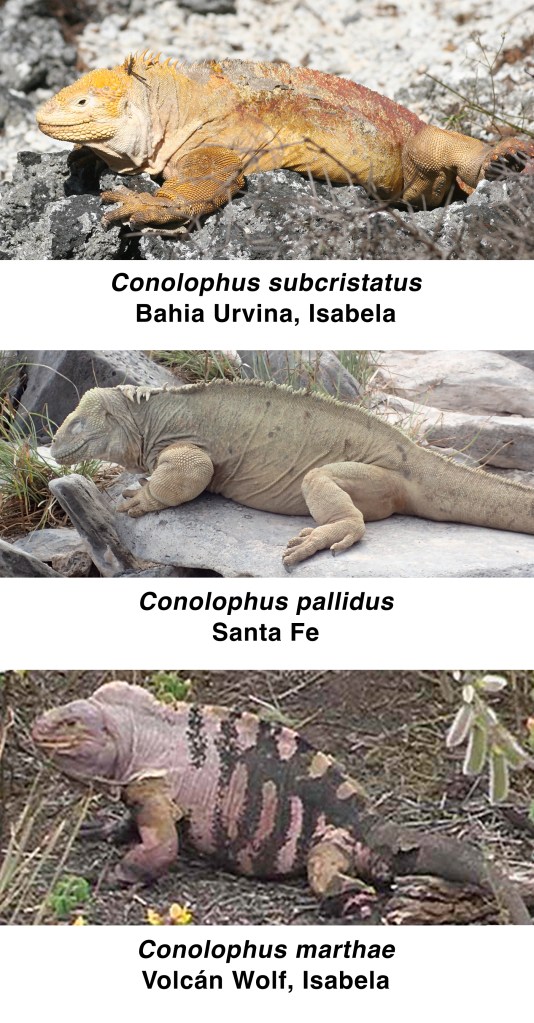 Quite surprisingly, a third species of Conolophus, C. marthae, was discovered by Galápagos National Park Rangers in 1986 on the northwest slopes of Volcán Wolf, the northernmost volcano on Isabela. Before it was finally studied and named in 2009, this new land iguana was informally referred to as the rosado, the pink iguana. Unlike the other two species, it is pink with black stripes. Rather than a pigment, the pink color seems to be the result of blood seen through colorless scales. The most surprising feature of the new iguana is that its split from the other two species is much older than the split between C. subcristatus and C. pallidus, yet they are found on the youngest island. It may be that they were once more widely spread across the archipelago and now remain as a relict population. They share their limited range with a small population of C. subcristatus. It is not clear to what extent, if at all, the two species compete with one another. Their population is small and they are considered to be highly endangered.