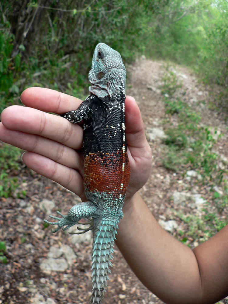 Land iguanas, like all iguanas, are vegetarians, subsisting mostly on the fruit and pads of Opuntia cactus. It is not unusual to see them sitting under a cactus, waiting for pieces to fall. They normally use their front feet to scrape the larger thorns from the pads, but they don’t seem to mind the smaller thorns. Usually they will gulp down a cactus fruit in just a few swallows. I once watched an iguana dislodge a thorn from its tongue by sticking the tongue out and dragging it back across its teeth several times.