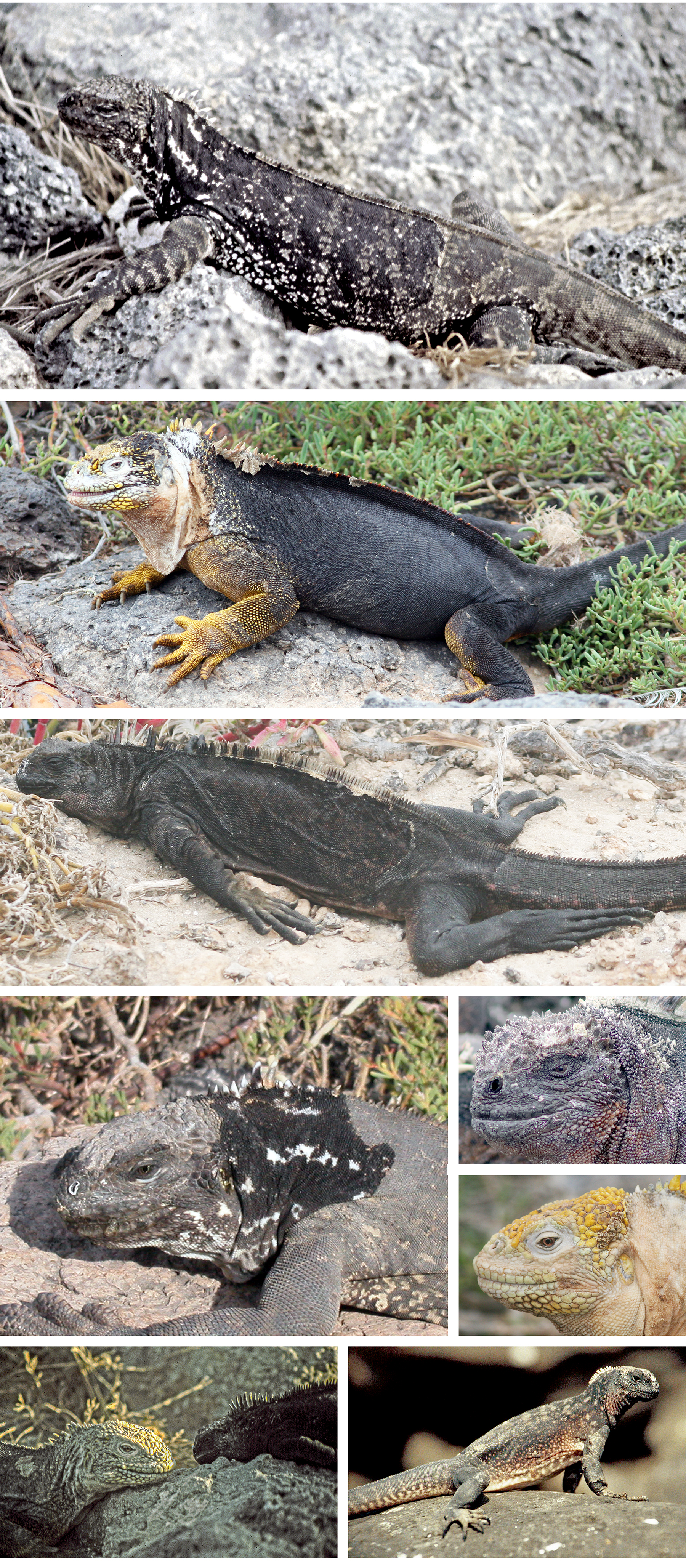 Row 5 Right: Young marine iguana showing juvenile striping pattern