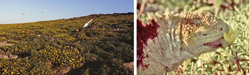 In addition to cactus, they also eat a variety of other plants including Cordia, Lantana, Castela, Alternanthera, Tiquilia, and Portulaca. Portulaca is a low-growing plant that is found in abundance on the western part of Plaza Sur. After a wet period, they blanket the island in yellow flowers. The flowers, however, last only a few days because they are eaten by the iguanas. For reasons unknown, land iguanas love anything yellow and they will bypass food that may be richer in nutrients in preference for a yellow flower such as is found on prickly pear cactus as well as on a number of other plants.