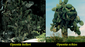 There is a very interesting relationship between tortoises and the various Opuntia species that inhabit the various islands. On those islands where there have never been any evidence of resident tortoise populations (e.g. Genovesa), the resident species O. helleri tends to spread low over the ground and has soft, flexible spines, whereas on islands that have established tortoise populations, the resident species, like O. echios on Santa Cruz tends to grow as trees. As young plants, the trunks are thickly covered with long, sharp spines which give way in older plants to a tough, tree-like bark. Thus, these Opuntias are inaccessable to the tortoise until the fruits, laden with seeds, fall to the ground, whereupon the tortoises eat them. The seeds pass unharmed through the tortoise’s gut and are dropped as the tortoise wanders from place to place.