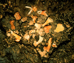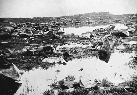 In the pristine state, tortoises had few natural enemies – mostly Galapagos hawks, and possibly owls, that preyed on the hatchlings. But in the age of man, tortoise populations have been depleted by human activity both directly and indirectly. During the whaling era, the tortoises were highly prized by sailors for provisions because they could live for long periods of time without food or water, with little deterioration. In the days before preserved food, this was of great value to sailors who visited the Galapagos and carried off many thousands of tortoises. Because interiors of the islands were so inaccessible, the sailors concentrated on the coasts and took away, therefore, massive numbers of breeding females. Feral animals have also wrought havoc on tortoise populations. Pigs, dogs, and rats dig up nests and eat eggs and young. Goats directly compete for food and donkeys trample nesting areas and change the topography from forested areas to grassy plains. Well into this century, people have continued to exploit the tortoises for oil. The photo below showing the remains of hundreds of tortoises slaughtered on Isabela for oil, was taken in 1906 by a member of the California Academy of Sciences expedition, and this activity has gone on up until the foundation of the National Park in 1959.