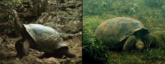 The 15 races of tortoises can be divided into two general morphotypes: domed and saddle-backed. In the domed tortoises, the front edge of the shell forms a low line over the neck while in saddle-backed tortoises, the front edge arches high over the neck.