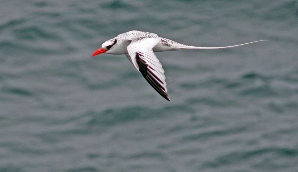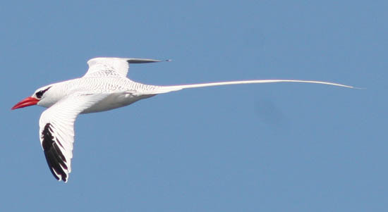 Tropicbirds, the smallest of the pelecaniformes belong to the family Phaethontidae which contains one genus, Phaethon, and three species. They derive their other common name, the “bosun bird”, from their characteristic “t’weee-eee” call which is reminiscent of a boatswain’s whistle. The Galapagos species, the red-billed tropicbird (P. aethereus) is also found in the tropical latitudes of the eastern Pacific, the Caribbean, and in the Indian Ocean. In Galapagos it is not uncommon to see them soaring along the cliffs where they make their nests, on islands such as South Plaza, Espanola, Genovesa, and N. Seymour. Tropicbirds are striking birds, with a vivid, white body, black wing edges and eye stripe, red bill, and two long, streaming tail feathers. Like some of the other pelecaniformes, tropicbirds are plunge-divers, feeding on squid and fish, well out at sea. After a dive, they bob back up to the surface, sitting momentarily, with their two tail feathers cocked in an upright position.