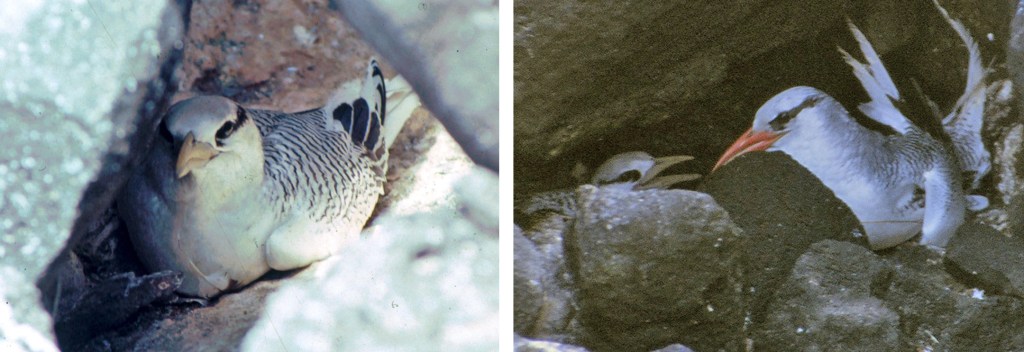 Tropicbirds court each other with an aerial display and callings. They make their nests on ledges and in holes and crevices in the cliffs, and lay a single egg on the ground. Both parents share in incubation and in feeding of the chick. The juvenile tropicbird looks much like its parents except that its bill is yellow.