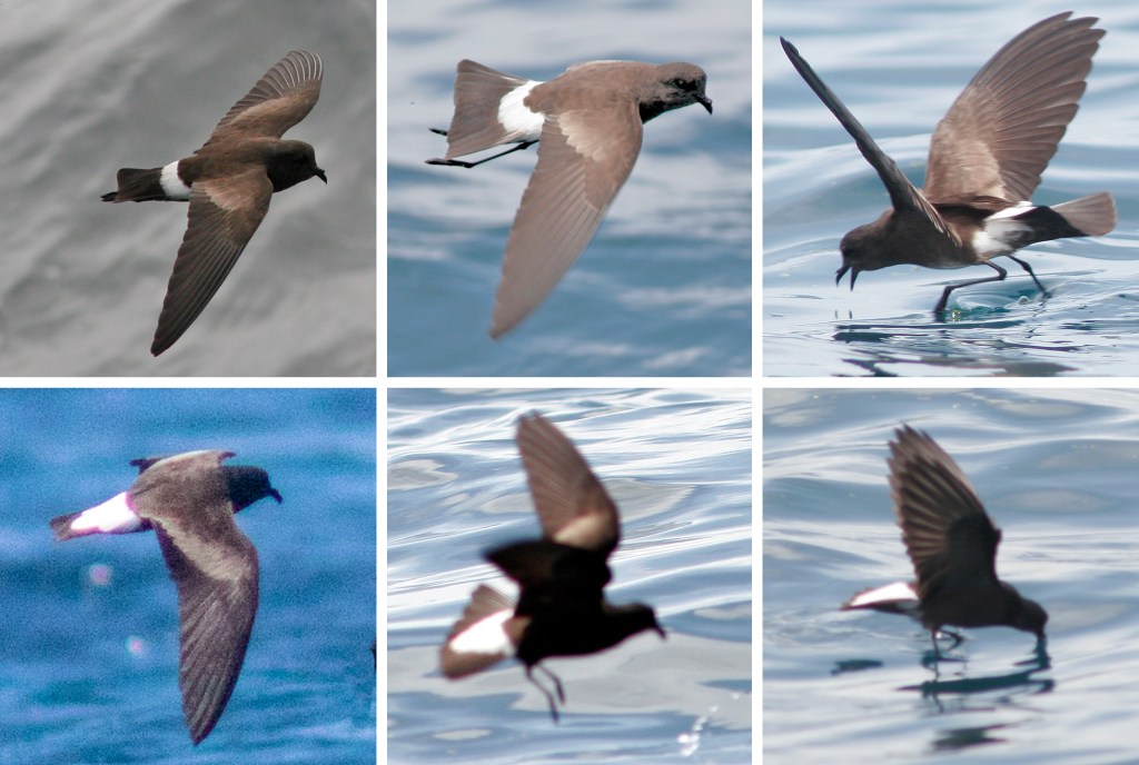 Storm petrels, or “Mother Carey’s Chickens”, as they have long been called by sailors, are the smallest of the Procellariiformes. The name “Petrel” is thought to be derived from St. Peter, because their habit of not quite landing in the water, but dipping their feet in and fluttering over the surface while they feed on plankton, makes them seem as though they are walking on water. Storm petrels are difficult to photograph, as is evident from the pictures below. Usually seen from a distance, they are small and move about quickly, dancing on the surface of the water like so many butterflies. The photos below are enlargements of individuals from groups of petrels. Of the dozens of photos I have taken over the years, these are the best of the lot.
