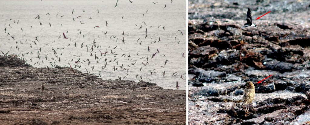 One well known site is on the cliffs above Prince Philip’s Steps on Genovesa. There, the birds nest in the numerous lava tubes and cracks that riddle the ground. The birds fly rapidly back and forth, seeming more like a swarm of gnats than a flock of birds. This area is also the only place where one can see short-eared owls (Asia flames galapagoensis), an endemic subspecies, during the day. In the absence of Galápagos hawks, the resident owls are diurnal. The owls stand on the lava field and watch as petrels land and enter their dens. Then they wait by the opening to catch the victim as it emerges.