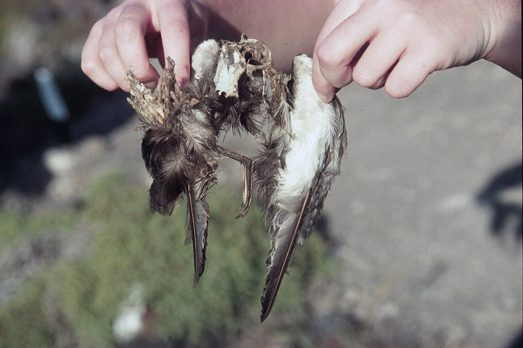 Typically owls eat all but the wings and breast bones. Even though owls on other islands are rarely seen during the day, their presence is evident via storm petrel remains. The remains in the photograph below were found on Plaza Sur.