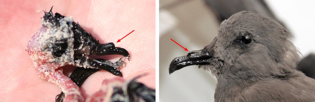 Typical of all procellariiformes, the nostrils of storm petrels lie in a tube at the rear of the beak. While only barely visible in the pictures of the live birds, the tube is obvious in the specimens below. The petrel on the left is the bedraggled carcass of a storm petrel on Genovesa that was being scavenged by a lava gull (Larus fuliginosis). The bird on the right is a mounted specimen of Leach’s Storm Petrel (Hydrobates leucorhous) at the Harvard Museum of Natural History.