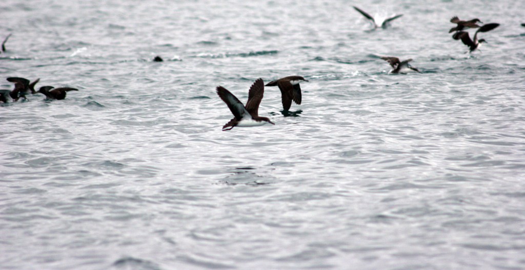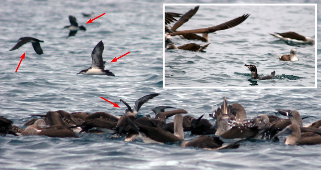 The Galápagos shearwater is a medium sized sea bird commonly seen from yachts. Typically, they skim close to the water, with intermittent periods of flapping and gliding. Shearwaters always seem to be on the move, either individually or in flocks, and it is not often easy to get a good sighting, let alone a good photograph. They are often encountered resting on the water, and as a yacht advances towards them they scatter. Most of my photos, accordingly are disappointing. However, it is not uncommon to see them fishing in large flocks, or in mixed flocks with pelicans and brown noddies, and then it is possible to approach them. In the case of photos below, we encountered a feeding frenzy of shearwaters, blue-footed boobies, frigate birds, pelicans, and a few penguins, and were able to quietly approach in a panga (the Ecuadorian term for a dinghy).