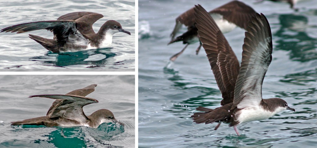As can be seen in the photos, Galápagos shearwaters have white bellies with dark brown wings and back, and a dark brown head with a white throat. They are most easily confused with the larger, less common Galápagos petrel (Pterodroma galalpagensis). Apart from size, the forehead and face of the Galápagos petrel is white. Much to my regret, I have never seen one.