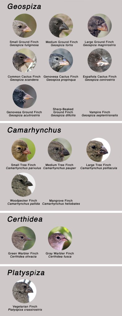 Traditionally, 14 species of birds have been recognized as Darwin’s finches – 13 in the Galápagos, and one on Cocos Island. Subsequently, several Galápagos species have been split, yielding 17 species. The Galápagos finches are currently divided into four groups, each representing a single genus: