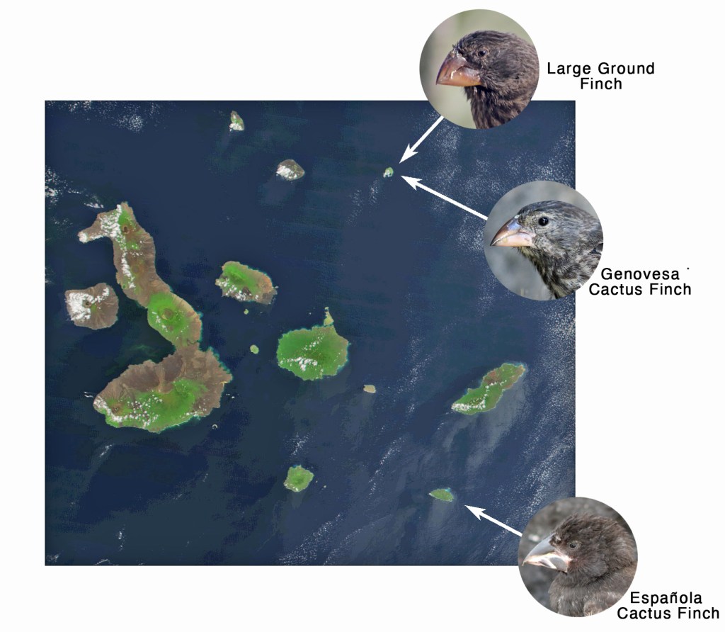 The cactus finches are an interesting example. There are three species but none of them coexist on the same island. The Española and Genovesa cactus finches shows what can happen in the presence and absence of a competitor species.