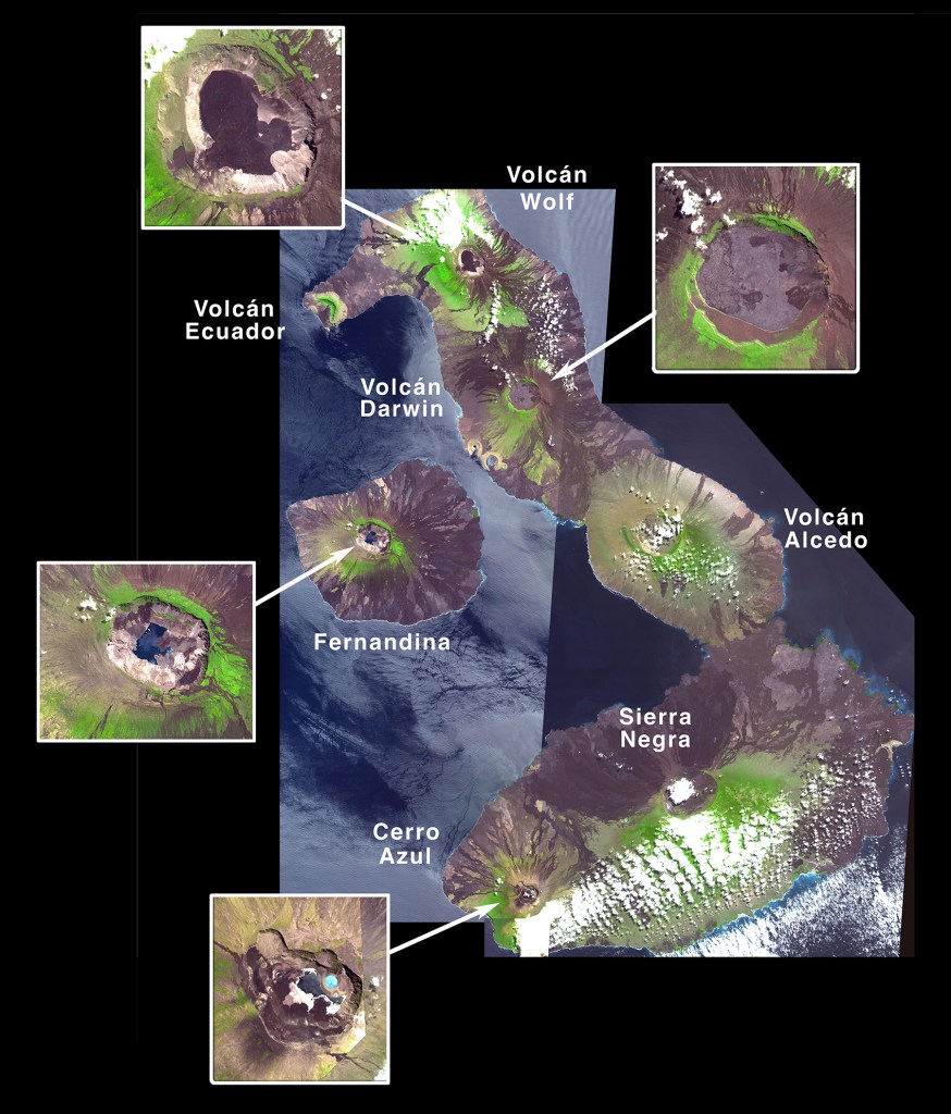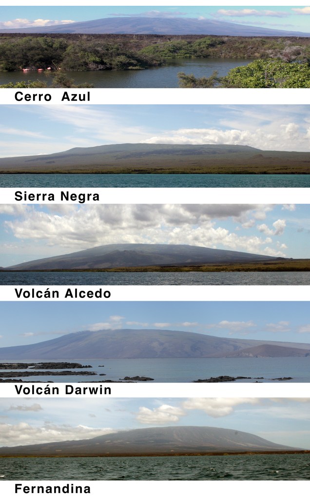 Albemarle Island [Isabela] consists of five, great, flat-topped craters, which, together with the one on the adjoining island of Narborough [Fernandina], singly resemble each other, in form and height. The southern one is 4,700 feet high, two others are 3,720 feet, a third 50 feet higher, and remaining ones apparently of nearly the same height. Three of these are situated on one line, and their craters appear elongated in the same direction. The northern crater, which is not the largest, was found by triangulation to measure, externally, no less than three miles and one-eighth of a mile in diameter. Over the lips of these great, broad caldrons, and from little orifices near their summits, deluges of black lava, have flowed down their naked sides.