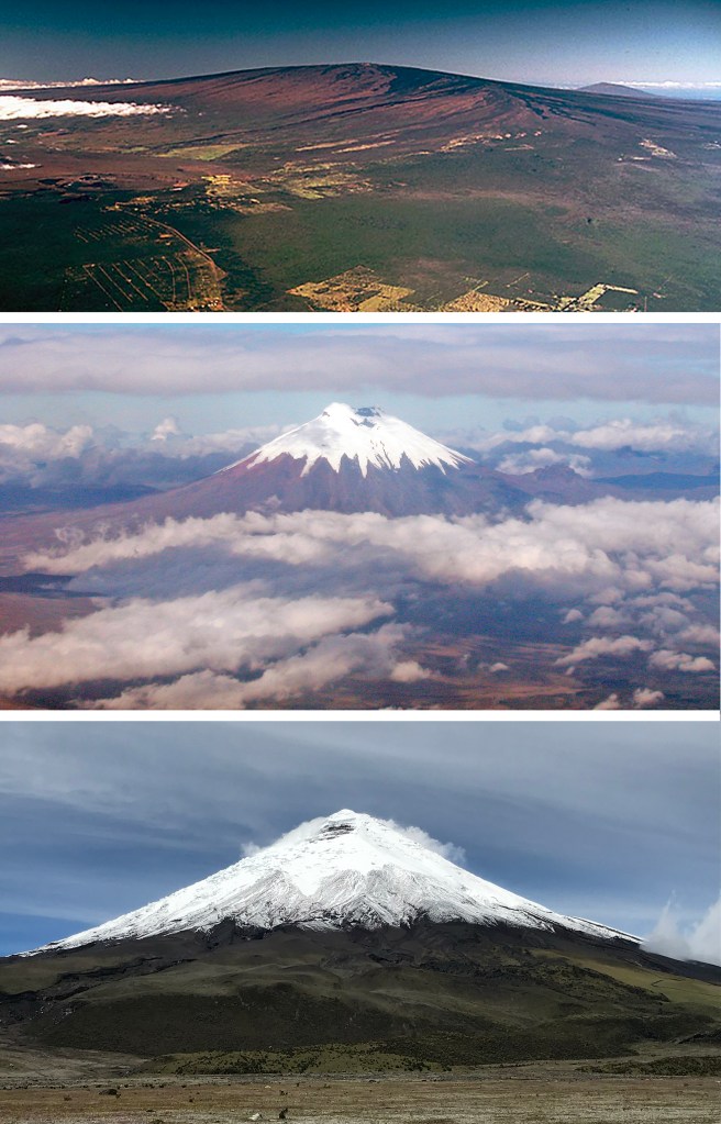 Center and Bottom: Volcán Cotopaxi from an airplane and at the national park in its full glory on a rare cloudless day