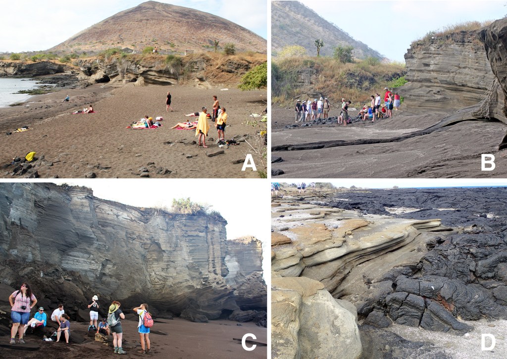 One final feature of tuff cones that must be mentioned is the base surge. Base surges, which were first recognized during analysis of atomic bomb tests, occur when gravity causes rising ash to fall back and spread horizontally. An eruption at Puerto Egas, probably from Cerro Pan de Azucar the large tuff cone that dominates the landscape at the visitor site (and is also the larger of the two cones at Punta Baquerizo), resulted in a base surge that formed the low, fine-grained cliffs along the beach at the landing site, and covered the young lava flows along the trail with volcanic ash.