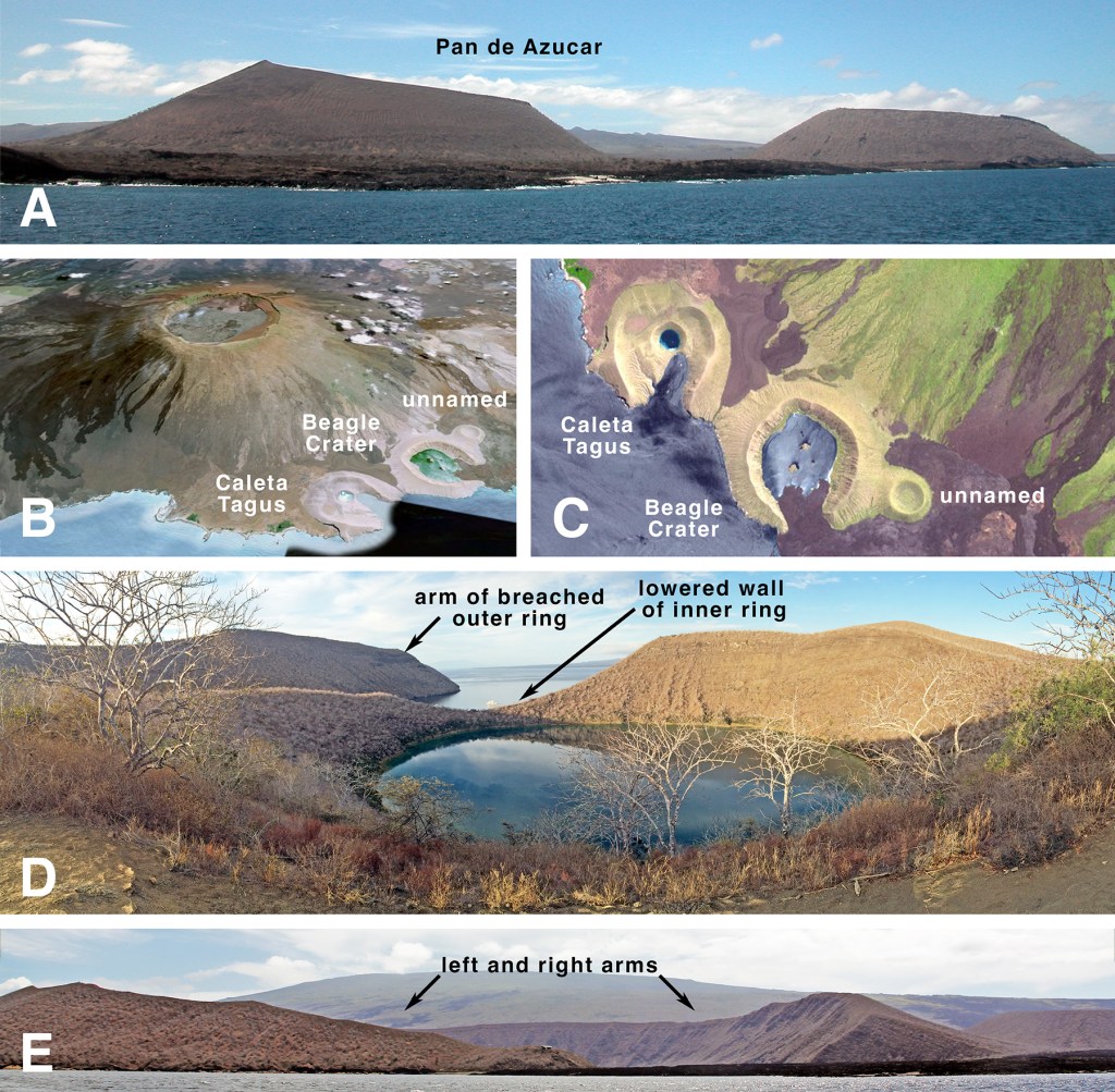 The twin cones at Punta Baquerizo, just south of the visitor site at Puerto Egas on Santiago are beautiful examples of tuff cones with lowered sides. At the foot of Volcán Darwin, Caleta Tagus features a pair of nested cones in which the outer ring is breached and the inner lowered. Nearby, the side of the Beagle Crater, which Darwin explored, is also breached.