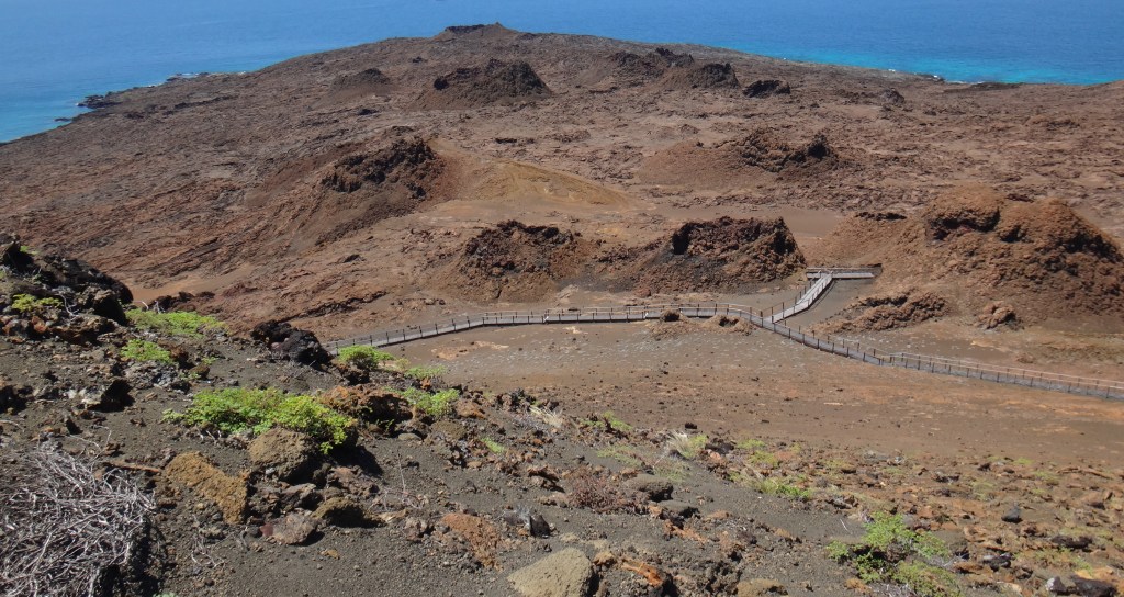 Scoria and spatter are ends of a spectrum, however, and while the resulting mound may be either a scoria cone (also called a cinder cone) or a spatter cone, fountains can also produce a combination of scoria and spatter. If the mass eruption rate is very high, the lava cannot cool at all and falls to the ground still molten. This lava, known as clastogenic lava, can pool on the bottom of the growing cone or it can breach the cone and emerge as a lava flow. Bartolomé is probably the best place in the Galápagos to view spatter cones. There are so many spatter cones on this tiny, barren islet that the landscape almost appears lunar. Scoria cones are less easy to see, but they can be viewed from tour boats on the flanks of the western islands like Fernandina. The trail from the summit of Sierra Negra down to Volcán Chico passes by a small but classic scoria cone.