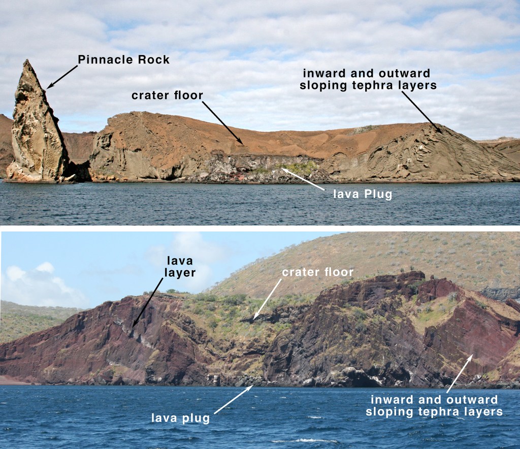 Once a tuff cone builds up high enough to protect the vent from further contact with the water, the crater then pools with lava that forms a plug as the eruption finally dies away. Tuff is easily eroded and there are a number of cones around the archipelago that reveal their inner structure. The one most often seen by visitors to Galápagos is the tuff cone on Bartolomé that includes the famous landmark, Pinnacle Rock. In this cut-away, one can clearly see the inward- and outward-dipping layers, the inner floor of the crater, and the lava plug. A dissected cone at Caleta Buccaneer features interbedded layers of ash and lava.