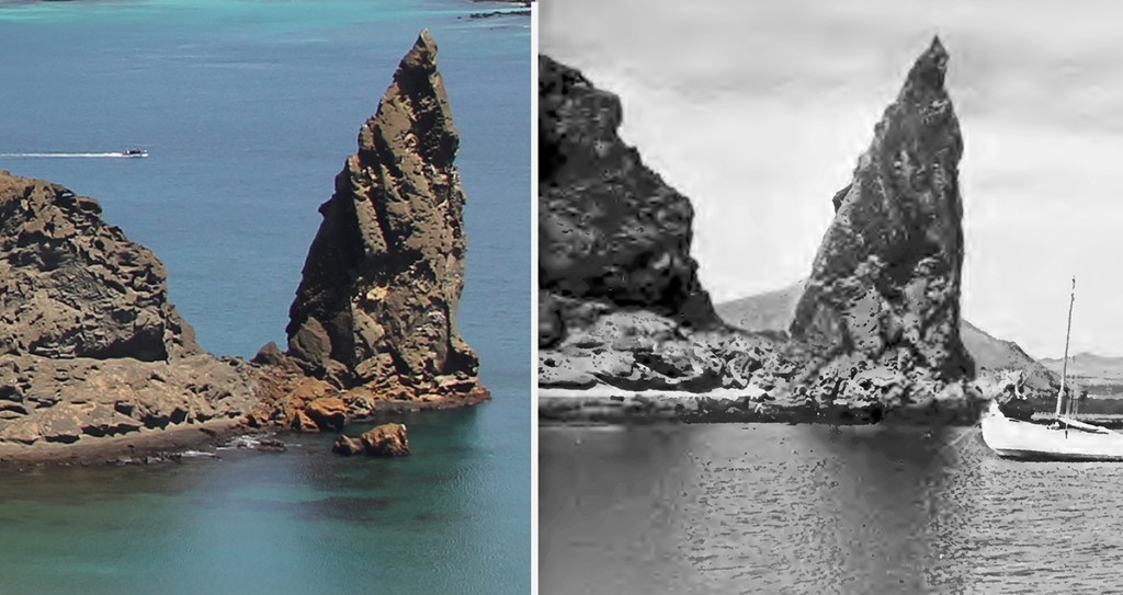Pinnacle rock itself is a highly resistant segment of the cone that stands nearly alone. In my years of travel to the Galápagos, I have heard many stories about how Pinnacle Rock was shaped by US Airforce pilots who used it for bombing practice. I have asked guides about this but have never gotten a clear answer. However, there appears to be no difference between the photograph I took in 2009 and a photograph in Voyages of Velero III (1939), a privately published account of G. Allan Hancock’s scientific expeditions in the Pacific..