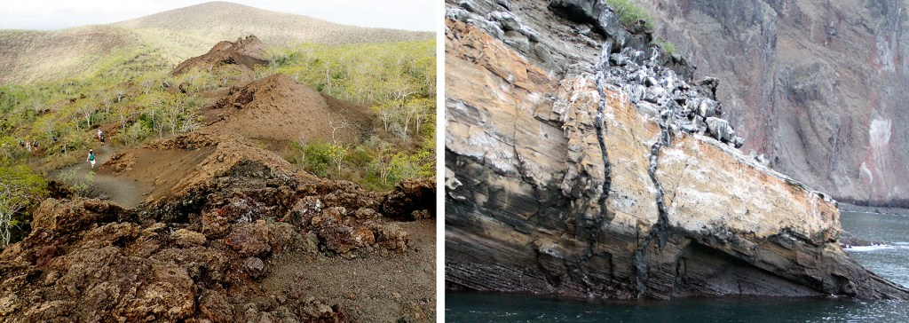 Right: Small lava flow from dikes cutting through the remains of a badly eroded tuff cone. Punta Vicente Roca, Isabela.