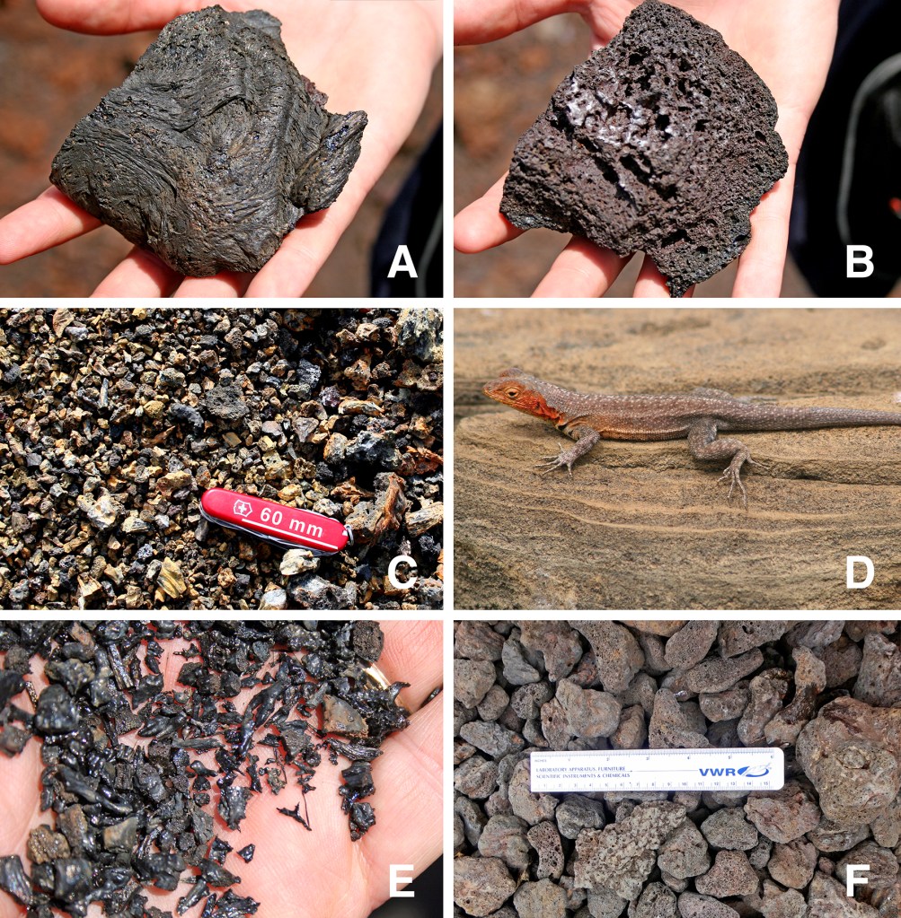 C: Lapilli. D: Ash with lava lizard (Microlophus Jacobi) for scale. E: Glass beads and filaments.
