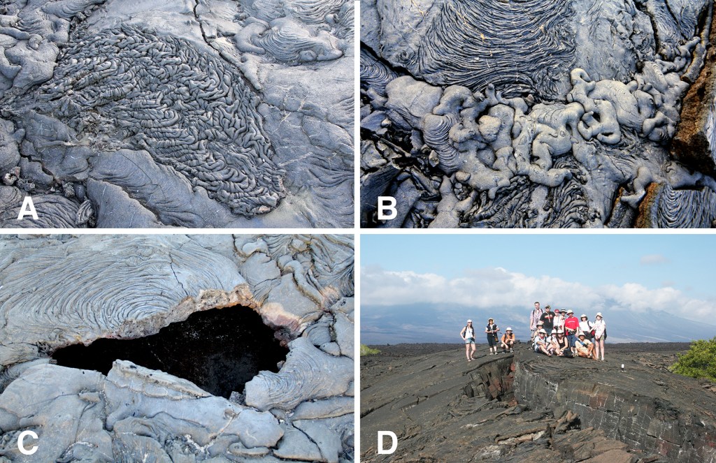 During a pahoehoe flow the surface loses heat by radiation and becomes viscous, insulating the underlying lava, which remains liquid and continues to flow. The cooler skin is carried along, crumpling and folding into twisted shapes. Early in the flow, when the lava is hotter, these twists have the appearance of ropes, but later, as it cools and becomes more viscous, the twists are shaped more like entrails. Occasional breaks in the crust are quickly sealed when fresh lava wells up, toothpaste-like, into the crack. Sometimes the leading edge cools to a point where it blocks the advance of the flow. As the eruption continues, more molten lava accumulates behind the frozen edge, causing the flow to swell, producing a gently rolling, hummocky surface. Occasionally so much lava accumulates in a flow that it swells into large pressure ridges, tumuli, that may split along the top. When the eruption finally ends, the lava underneath the crust may drain away leaving cavities into which the crustal roofs ultimately collapse. At Punta Moreno (see below) one year, my foot broke through the surface of the flow. Fortunately, the chamber wasn’t deep, almost to my knee, and I pulled my leg out all bloody. It looked bad, and potentially it could have been serious, but I only suffered a bunch of minor scratches.