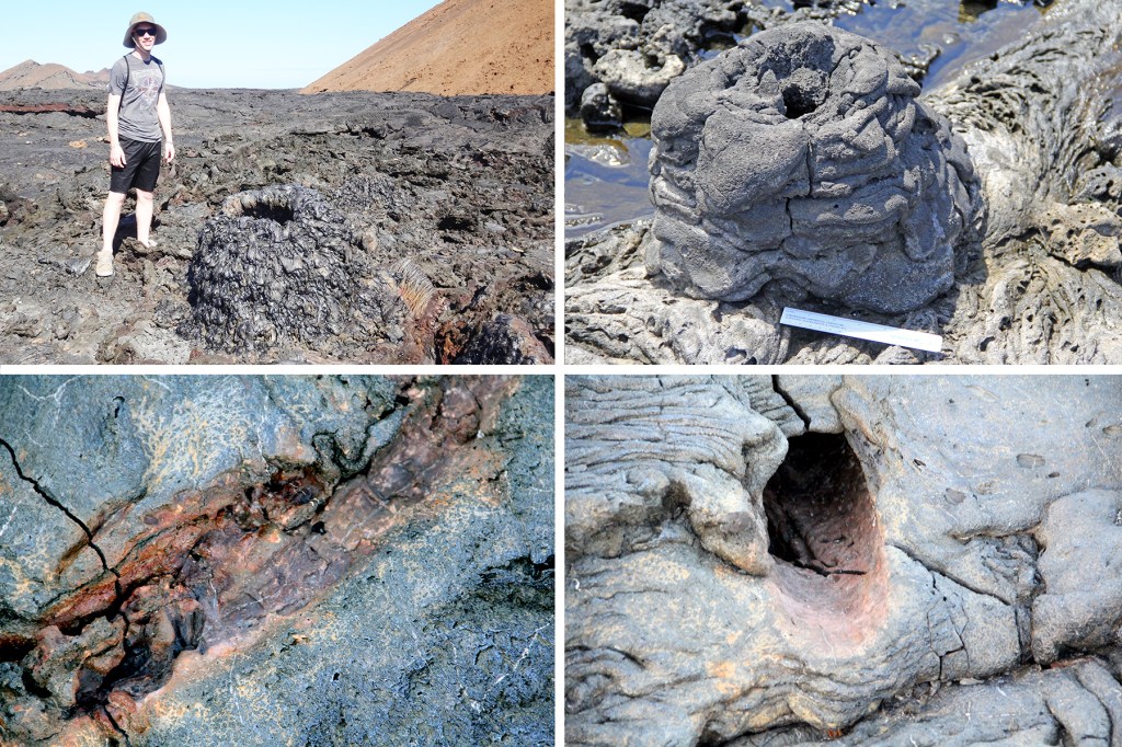 Sometimes pockets of trapped gas burst from the surface of the flow building hornitos (Spanish for “little oven”), tiny cones formed when gobbets of lava thrown up by released gas falls back and piles up into a little mound around the vent. Hornitos can also be formed when lava along the coast flows over a puddle of water that then flashes to steam. Other features of pahoehoe flows are tree molds that form when lava flows up against a tree and then chills, creating a mold. After a few moments the tree bursts into flames and is destroyed, but its surface is forever impressed on the chilled lava left behind.