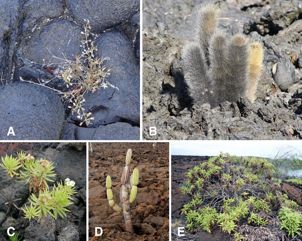 Bottom: Darwin’s daisy, Darwiniothamnus lancifolius (C), candelabra cactus, Jasminocereus thouarsii (D), and Scalesia affinis (E). All five are endemic.