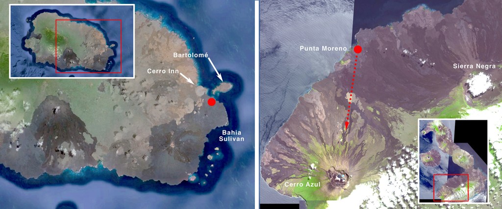 Just before the turn of the 20th century, massive lava flows covered the southern part of Santiago, extending from Bahia James on the west side around to Bahia Sulivan on the east. Visitors who walk on the Sulivan bay flow are often profoundly affected by the seemingly endless bareness of the lava. The pahoehoe flow at Punta Moreno, Isabela, at the foot of Sierra Negra, is similar to Bahia Sulivan but was emplaced 200 to 1000 years ago, and the differences are dramatic. While the younger flow is jet black and nearly intact, the older lavas at Punta Moreno have oxidized from shiny black to rusty red-brown, and the roofs of vacated chambers have collapsed in many places. Stepping over the lava fragments results in loud clinking sounds (these rocks are often called “clinkers”).