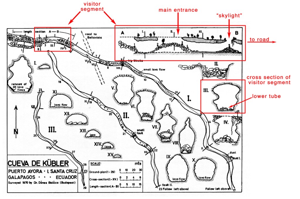 The largest lava tubes that are open to tourists are on Santa Cruz, the most accessible being one just outside Puerto Ayora just off the road up to Bellavista. This cave was discovered by an early German settler, Karl Kübler, and was known, accordingly, as La Cueva de Kübler. It has over time been known by other names such as El Tunnel, La Cueva de Puerto Ayora, and, currently, El Mirador. The cave was surveyed in 1970 by Hungarian geographer and karst researcher Dénes Balázs.* La Cueva de Kübler, as Balázs called it, is 852 m long (just over half a mile), nearly 6 m high and 5.5 m wide. The portion of the cave that is actually visited is quite small, corresponding to the section A—B on the Balázs’s map below. The height of the ceiling is increased by the breakthrough of a smaller parallel tube running above the main cave, and a later eruption has left a small tube whose roof is also collapsed, running along the floor of the cave. Along the walls are marks showing past levels of lava as it flowed through the tube and ultimately drained away. At the distal end of the tunnel solidified lava reduces the height of the tube from an initial 10-12 m to only 2-3. There are two entrances to the tunnel. The first, about 25 m from the road, is a small opening in the roof, creating a “skylight” in the cave’s ceiling. I was amused by a National Geographic video about the Galápagos that showed the host being lowered by tackle into the cave through this skylight. It all seemed dark and mysterious. However, another 40 m or so farther down the trail there is a much bigger opening in which the block-like fragments of the collapsed roof form a relatively easy staircase into the cave. That’s how they got the big IMAX camera into the cave to film the host’s descent. In the photos below, (A) is the skylight and (B) is the main entrance. I have visited this cave many times, but on my last visit in 2023 it was barricaded off. Our guide did not know why it was closed or if it would be re-opened.