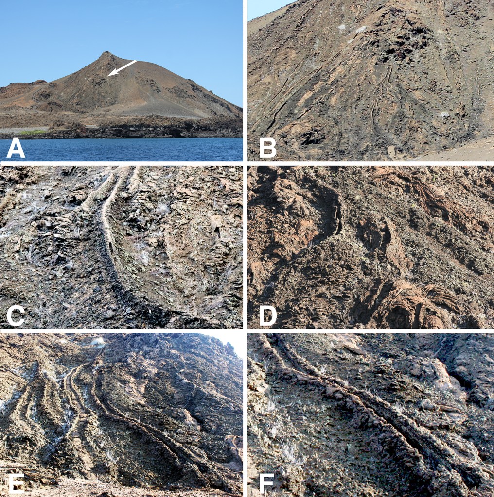 Bartolomé offers excellent examples of small tubes and levees. In the figure below, (A) is a view of the main cone, the summit of which offers a spectacular view of Pinnacle Rock, the tuff cone Cerro Inn, and the extensive Bahia Sulivan lava flow. There is a vent part way up the slope (arrow) from which a number of lava channels emerge. (B) is a detail. (C) and (D) are small lava tubes, probably the size of one’s thigh, with partially collapsed roofs. (E) shows several levees, and (F) is a detail. These features are easily seen from the boardwalk that runs by the base of the slope and ultimately climbs to the summit.