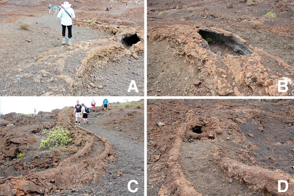 The photographs below are of a larger lava channel running alongside the trail from Sierra Negra down to Volcán Chico, Isabela. (A) and (B) are at the beginning of the channel looking downhill while (C) is from the end looking uphill. At the beginning, the channel has a roof with a partial collapse, but as it continues downslope the channel becomes a levee. That the difference between the two sections is a change from tube to levee is obvious when comparing the edges of the broken roof (B) with the edges of the levee. Finally, just before the channel disappears, it reverts back to a tube (C and D).