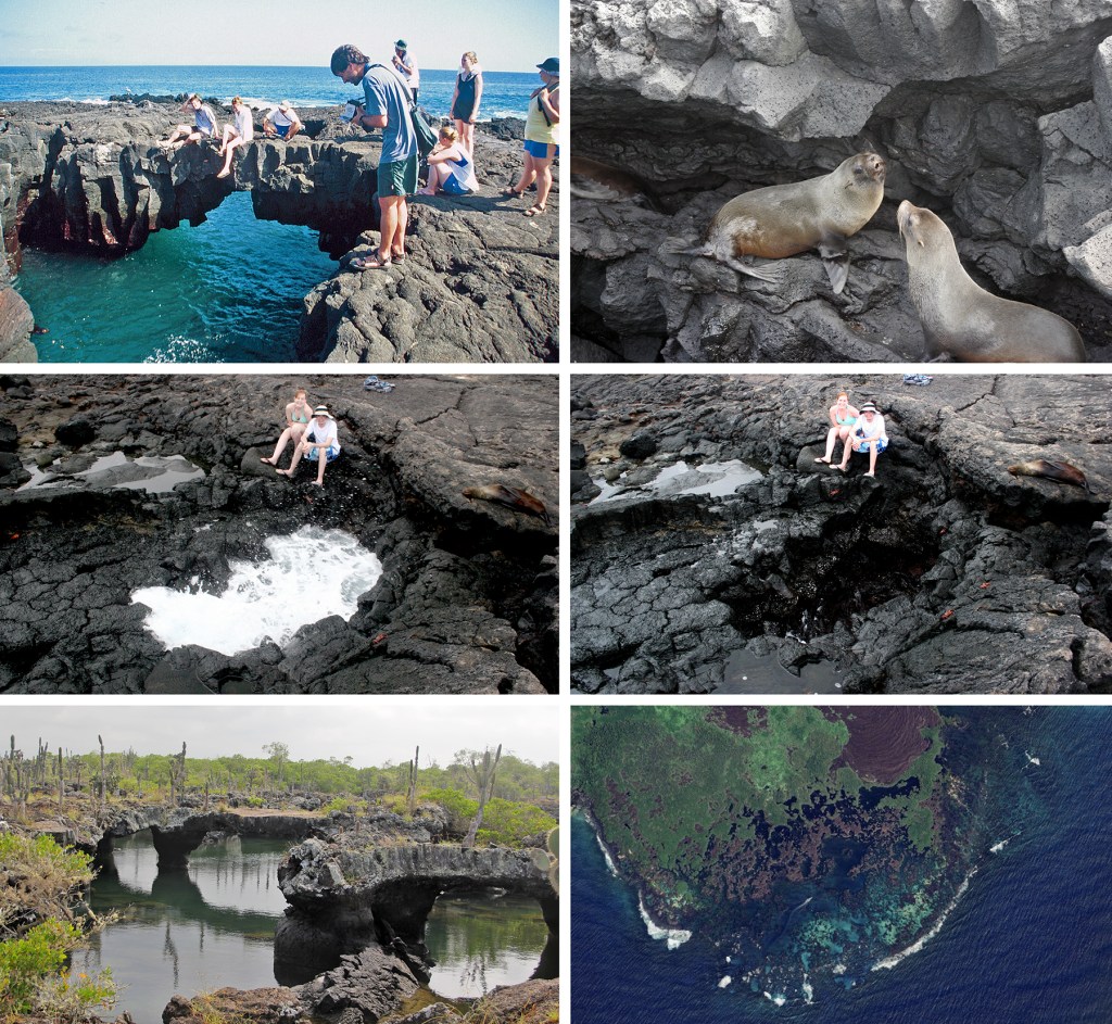 In addition to the highland lava caves, there are a number along the coast, running out to sea. El Túnel de Estero lies just off the trail from Puerto Villamil, Isabela, to the Wall of Tears, the remains of an Ecuadorian prison camp, and is a relatively small, intact tube. But there are larger, more degraded lava tubes at other sites. The Fur Sea Lion grotto is the remains of a lava tube in which an arch is merely a fragment of the cave’s roof. There, fur sea lions sequester themselves in the relative dimness of the rocky ledges while they wait to begin their nighttime forays. At one time, snorkeling was permitted in the grotto. The photograph here is at low tide. At high tide it was necessary to dive under the arch. Another vestige of the tunnel, Darwin’s Toilet, lies just a few meters inland from the grotto. This is smaller opening into the tube in which sea water rises and falls with the ebb and flow of waves. Cabo Rosa, Isabela, is an extensive area of broken, flooded lava tubes. As can be seen from the Google Earth image, it is an archipelago of pillars and arches, all that is left of a complex network of lava caves. The primary visitor activity there is snorkeling, and it is a positively amazing experience.